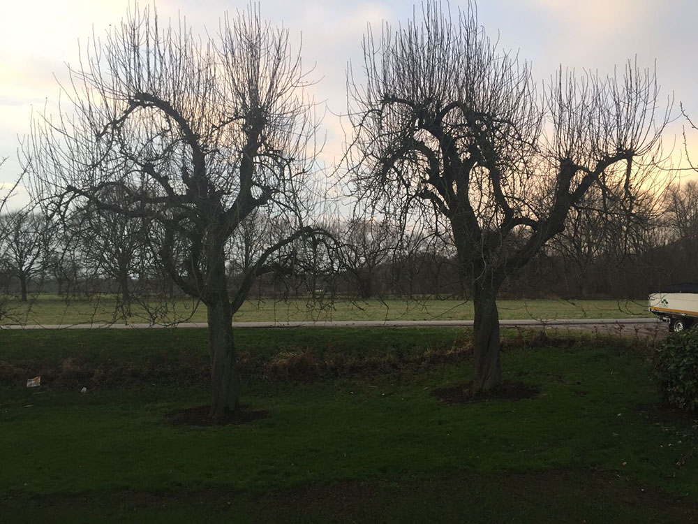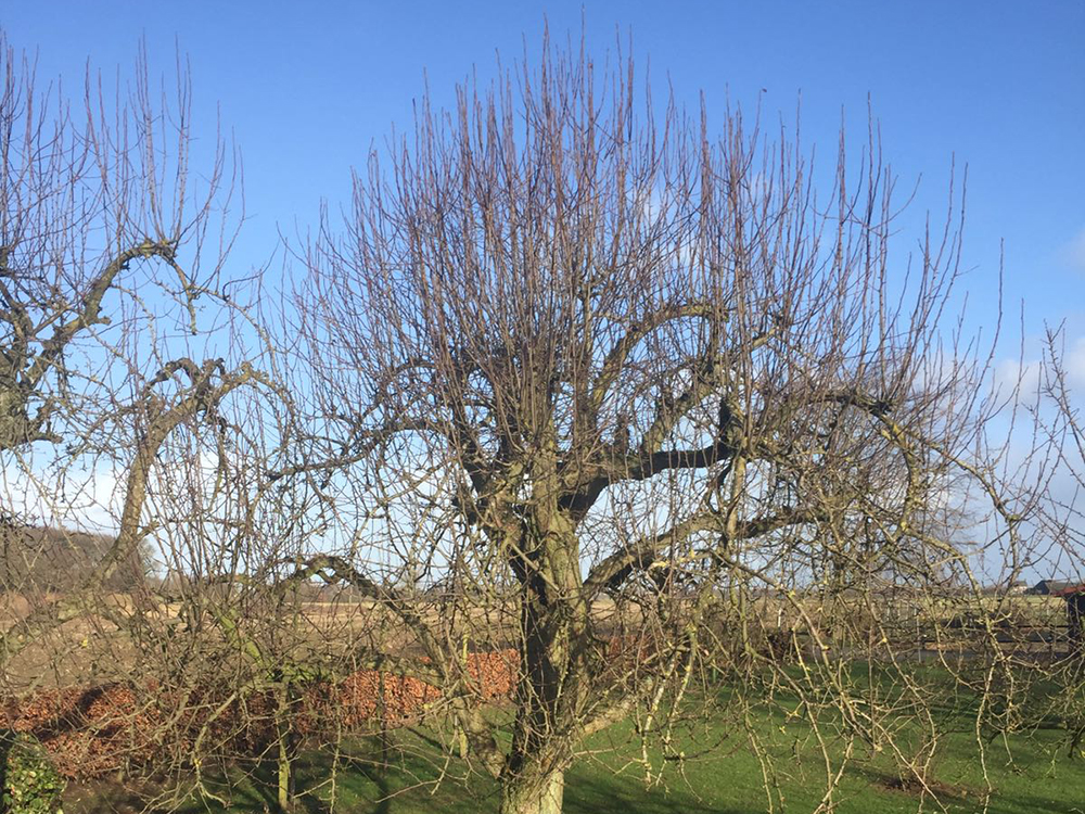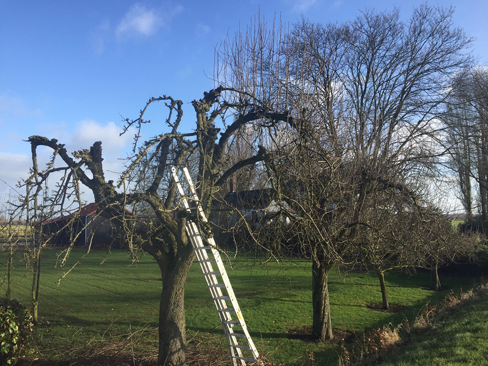 Op deze bijzondere plek in Wilp Voorsterklei met prachtig zicht op de Ijssel, was het hoognodig om de perenbomen te snoeien. Snoeien draagt bij aan een optimale vruchtdracht. De beste periode om perenbomen te snoeien is jaarlijks van november tot maart. Het waterlot moet er dan uit, dat zijn de rechtop gaande scheuten die bovenin de kroon voornamelijk zichtbaar zijn. Door het snoeien wordt de perenboom gestimuleerd om vruchten aan te maken en op die manier gaat de voeding niet verloren in het waterlot. Waterloten zijn geen vruchtdragende takken namelijk.