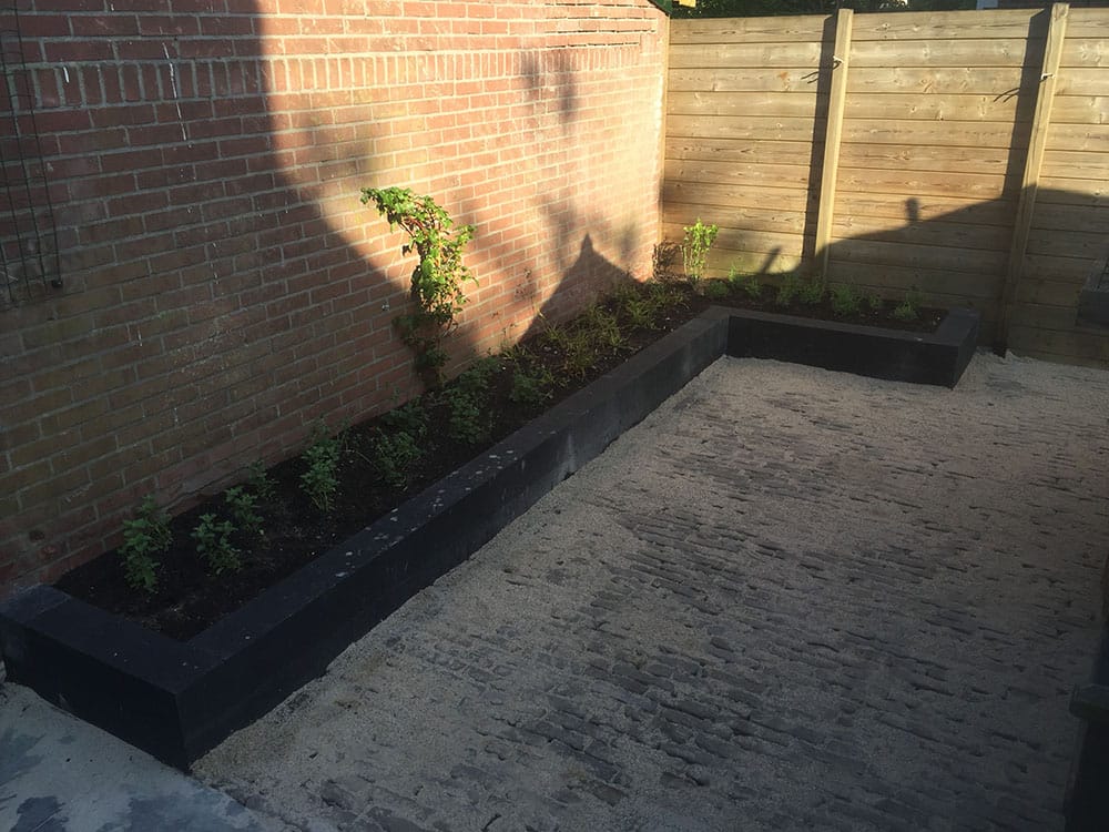 Van een lege zandtuin naar een volledig gerenoveerde tuin! Na een goede referentie van een bekende uit Bathmen kwam deze klant uit Deventer bij hovenier Bronzewijker Groen terecht. Wij mochten voor deze klant de complete tuinbestrating aanleggen, de beplanting leveren en een handig opslaghok voor hout realiseren. Voor de bestrating koos de klant een mooie combinatie van Oudhollandse klinkers (ook wel waaltjes genoemd) met antracietkleurige tegels van 60 cm x 60 cm. De plantenbakken zijn gevuld met diverse soorten planten waarbij we rekening houden met het groeiseizoen, zodat er in de bak verspreid over de seizoenen altijd planten bloeien.